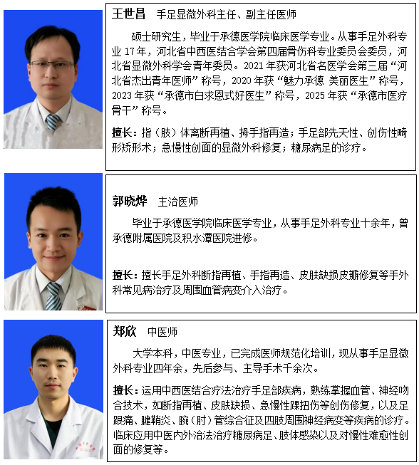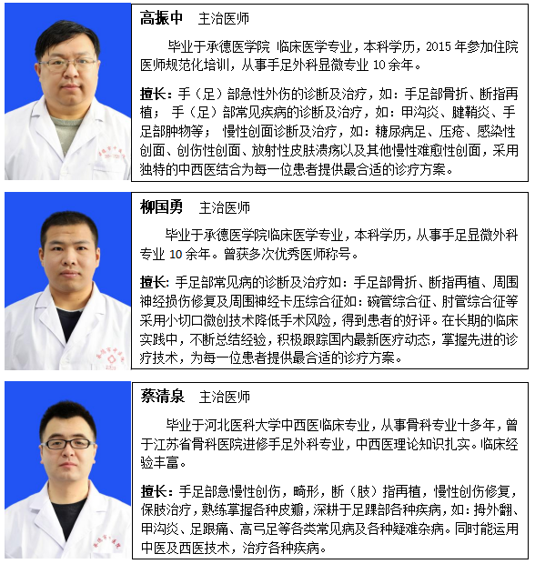 我院手足显微外科成立于2007年,是我市最早成立的手足外科专业科室,市级名科,是我院重点打造的学科之一,河北省糖尿病足联盟单位。科室现有医护人员16名,其中医生7名,护士9名。科室成员多次到北京积水潭医院,省三院等医院进修学习,医护人员理论基础扎实,临床技术精湛,技术水平领先。