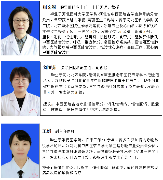 承德市中医院脾胃肝胆科是集医疗、教学、科研为一体的科室,在中西医结合治疗消化系统疾患方面形成了自己的特色诊疗方案,采用病症结合、中药复合干预、内病外治等方法治疗疾病,在同行业中特色突出,疗效显著,深受广大患者的信赖。