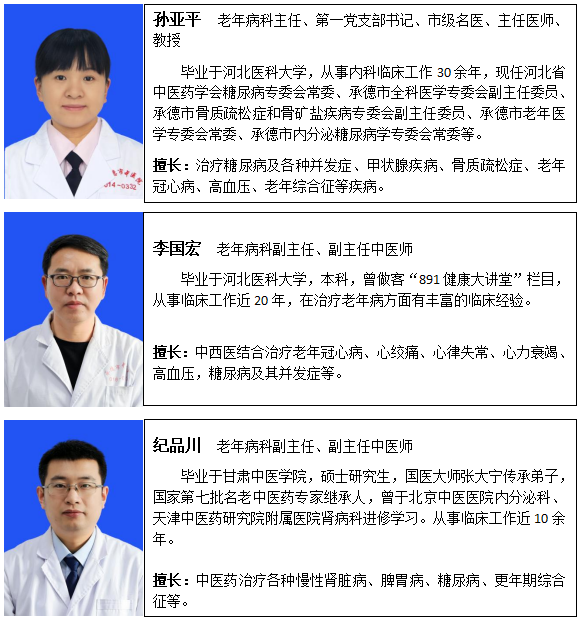 承德市中医院老年病科是国家中医药管理局“十二五”重点专科,国家中医优势专科建设单位,承德市市级医学重点学科,“老年疾病国家临床医学研究中心--核心网络单位”。先后获得河北省总工会“工人先锋号”,“创建三甲优秀科室”“白求恩式先进集体”荣誉称号。建设有“国医大师张大宁内分泌工作室、肾病工作室”、“省级名中医工作室”、“市级名中医工作室”“中医药针药结合治疗消渴病痹症”重点研究室,为河北省中医内分泌糖尿病专科联盟成员单位,与天津中医药研究院附属医院建立“京津冀中医药协同发展肾病专科联盟”。目前开放床位55张,门诊诊室3个。科室现有医护人员23人:其中医生10人,硕士研究生以上学历7人,有国医大师张大宁传承弟子、国家第七批名老中医药专家继承人等优秀人才。