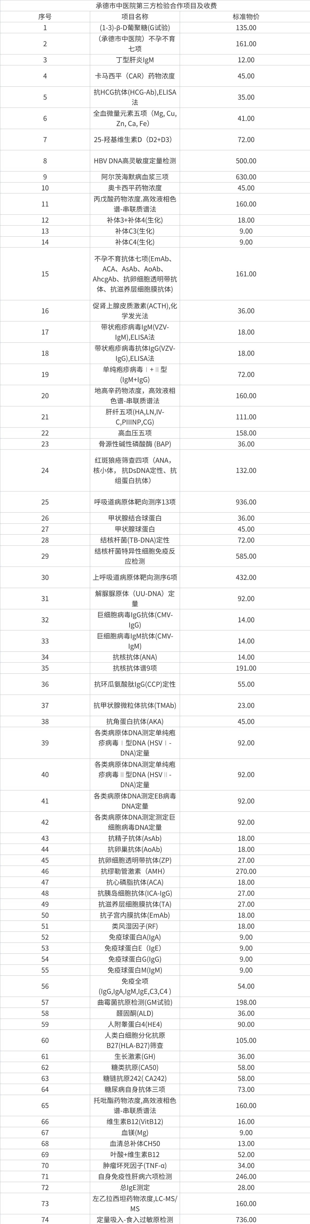 承德市中医院第三方检验合作项目及收费